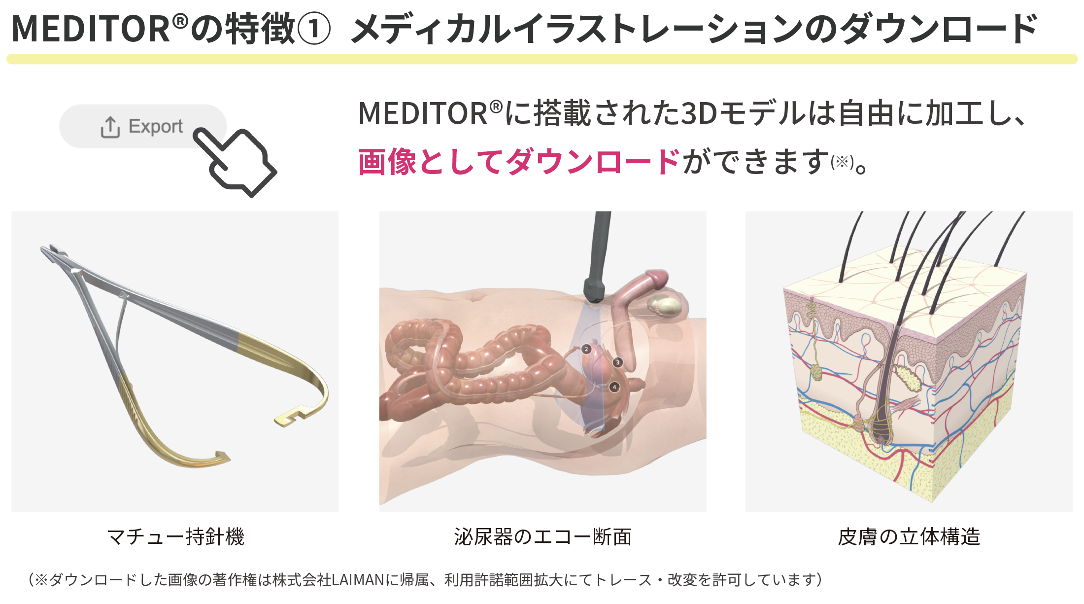 MEDITOR®は、あなたが欲しいメディカルイメージを自分で創り上げてダウンロードするWEBアプリケーションです。 ダウンロードしたイメージは利用ルールがわかりやすく、ロイヤリティフリーなので迷うことなく個人的なSNS発信から、商用利用・論文投稿まで幅広くご利用いただけます。 (商用利用はプランに制限がございます)