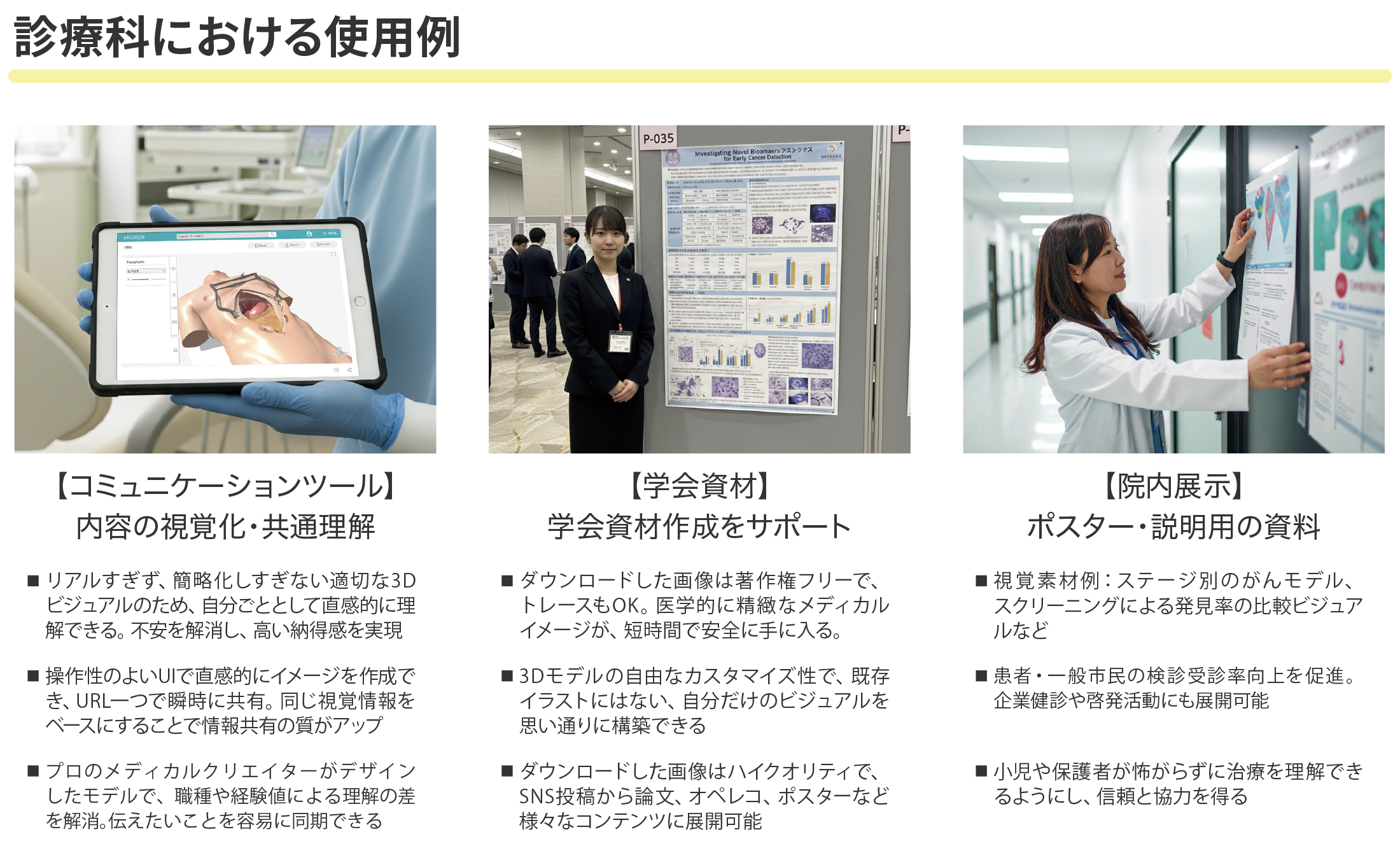 MEDITOR®︎は、スライド作成や院内教育、説明資料づくりを支援する3Dコンテンツツールです。解剖・疾患・治療の理解を助ける医学3DCGモデルが300点以上搭載されています。テキストや画像、動画などの既存資料に3Dモデルの画像を組み合わせることで、構造や関係性を視覚的に整理して伝えることが可能になります。これまで言葉や平面図では説明しにくかった内容もスムーズに共有できます。プレゼンテーション、説明用スライドなどにご活用ください。MEDITOR®︎は医療情報を正確に、効率よく伝えるための表現手段として、日常の資料作成をサポートします。